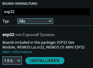 - Geben Sie im Textfeld "esp32" ein und installieren Sie die Bibliothek namens „esp32 von