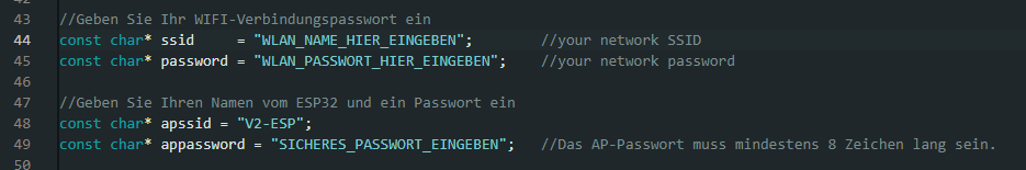 Ersetzen Sie in der Arduino IDE ab Zeile 44 "WLAN_NAME_HIER_EINGEBEN" und geben Sie den Namen ihres WLAN-Routers an. Auch benötigt wird das Passwort von ihrem Router / AP - ersetzten Sie "WLAN_PASSWORT_HIER_EINGEBEN" (Zeile 45) dadurch.
