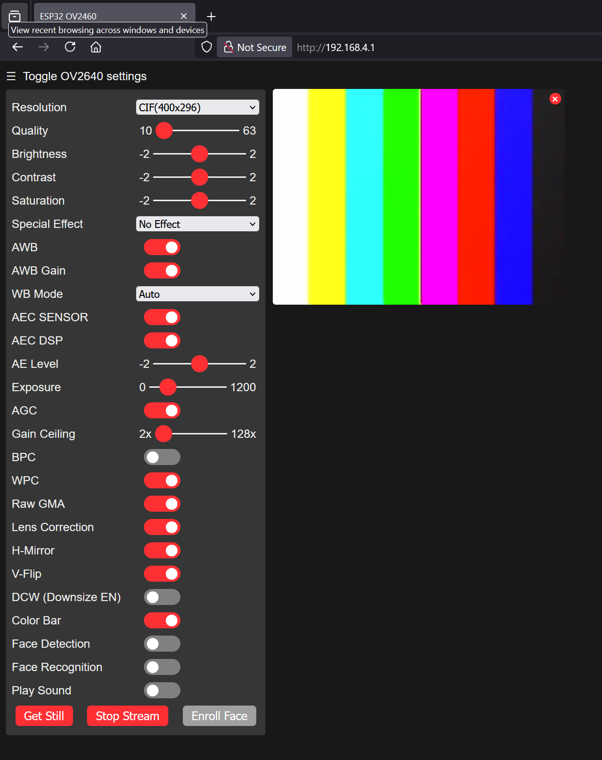 Im linken Bereich können einige Bildeinstellungen getätigt werden. Über den Button "Start Stream" im unteren Bereich kann ein Livebild der Kamera im rechten Bereich angezeigt werden.